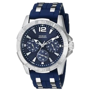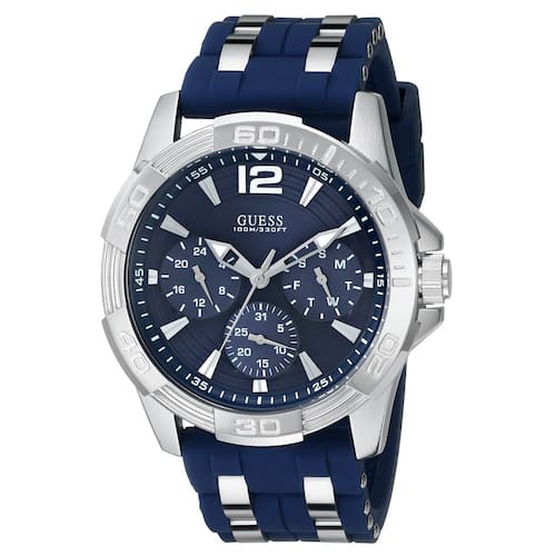 Guess Iconic Relógio de silicone azul resistente a manchas em aço inoxidável com dia, data e 24 horas de horário militar/internacional.