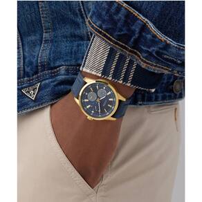 Relógio Guess Masculino Peak GW0964G2 Azul Este relógio esportivo dinâmico combina cores vibrantes com sofisticação, apresentando uma caixa redonda de 44 mm em aço reciclado escovado e polido em tom dourado, combinada com uma pulseira de silicone índigo com costuras chamativas. O mostrador sunray índigo apresenta recursos multifuncionais e adiciona profundidade e dimensão a este design de inspiração atlética. Com resistência à água de 50 metros, este relógio marcante é perfeito para o homem que busca uma sofisticação esportiva que acompanhe seu ritmo. Especificações Técnicas Mecanismo: Analógico Quartzo Gênero: Masculino Visor: Azul Vidro: Cristal mineral Prova d'água: 50m Características: Cronógrafo e pulseira de silicone Diâmetro da caixa: 44 mm : 1 ano pela fabricante Guess Marca: Não Informado Ean: 7909669215912