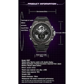 Especificações [Perfeito para esportes]: Desenhado com resistência à água 5ATM, é o parceiro ideal para nadar.[Visual e função]: A tela de LED e luz de fundo garantem visibilidade em qualquer situação.[Inovador com Estilo]: Equipado com cronômetro, cronógrafo, e funções automáticas para quem gosta de tudo no relógio.[Design Robusto]: Feito de resina durável, é seguro e estiloso.[Adaptável]: Pulseira de 26cm ajustável com fecho de fivela pra te acompanhar em tudo.