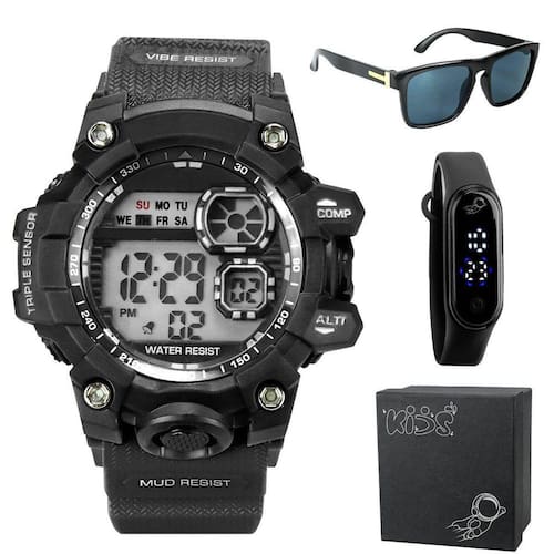 Relogio infantil digital prova dagua + caixa + oculos sol adolescente alarme qualidade premium preto Conjunto estiloso orizom kids para meninos: relógio, óculos e caixa exclusiva