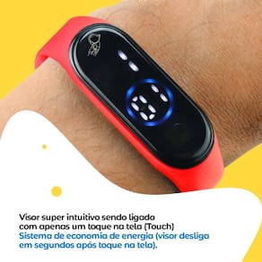 - Pulseira: Vermelha em silicone, ajustável