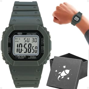 Características do produto: - Relógio digital infantil com formato quadrado - Cor: cinza - À prova d'água - Funções: luz de LED e cronômetro - Pulseira ajustável de silicone, servindo em qualquer tamanho de pulso - Caixa ultra premium com temática de foguete, nas cores preto e branco - Indicado para crianças a partir de 6 anos e adolescentes de qualquer idade