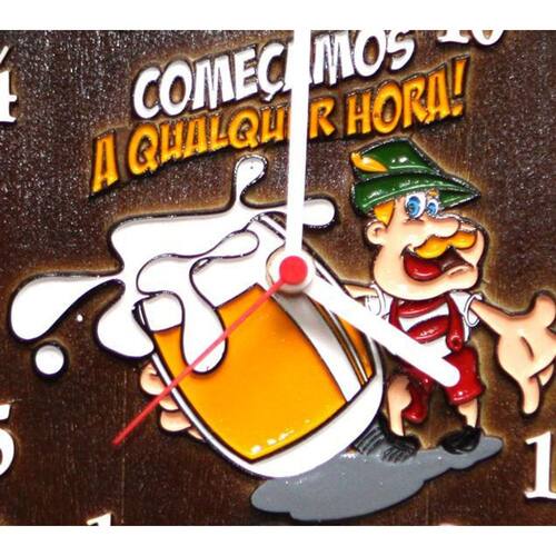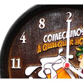 O Relógio Horário Qualquer Hora Pequeno, é um divertido relógio com os dizeres: Começamos a qualquer hora. Com os números todos misturados, dá-se a piada do pq é a qualquer hora. O Relógio Barril decorativo é confeccionado em fibra de vidro, simula de forma realista a tampa de um barril de madeira de carvalho com um relógio. Uma peça funcional e muito bonita. Ideal para decoração de bares, churrasqueiras, espaço Gourmet, salão de festas e decoração em casa. Tem o diâmetro de 26 cm de diâmetro por 7cm de altura. Essa peça é para ser pendurada na parede.