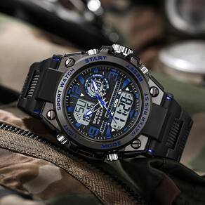 - ?Multifunções: 1. Mostrador duplo analógico e digital suporta dois fusos horários diferentes 2. Alarme 3. Luz traseira de LED (mostra a hora clara no escuro) 4. Data 5. Cronômetro 6. Opção de formato 12/24H 7. Resistente a impactos. Essas funções o tornam perfeito para todos os tipos de esportes e uso diário