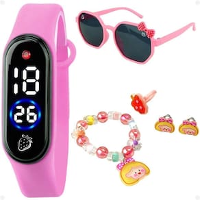 Relogio Led Infantil + Pulseira Brinco + Anel + Oculos Sol Silicone Pink Presente Criança Garota Led Kit de Acessórios Infantis Orizom Kids - Relógio, Pulseira, Brincos e Anel Encante as crianças com este maravilhoso kit de acessórios infantis da Orizom Kids! Perfeito para presentear os pequenos e oferecer estilo e diversão, este conjunto traz um relógio infantil digital LED em formato de bracelete, uma pulseira com pingente em forma de rosto de criança, um par de brincos e um anel universal, todos com a temática de morango e rostinho de criança.