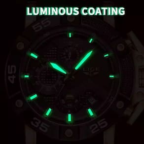 Equipado com cronômetro, funções de cronógrafo e calendário completo, este relógio não deixa nada a desejar. Com resistência à água de 3 Bar, você pode nadar e aventurar-se sem preocupações. As mãos luminosas garantem visibilidade mesmo em ambientes com pouca iluminação, facilitando a leitura do tempo a qualquer hora do dia ou da noite.