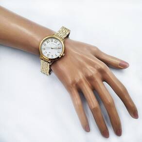 Características Formato do Relógio: Redondo Composição do Vidro: Cristal mineral Material da Caixa: Aço Inox Cor da Caixa: Dourado Cor do mostrador: Branco Material da Pulseira: Aço Inox Cor da Pulseira: Dourado Mecanismo: Analógico Quartz