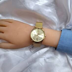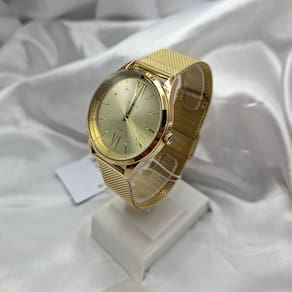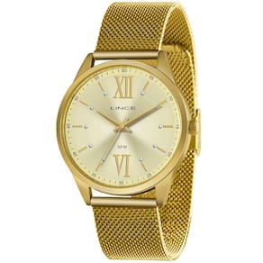 Características Formato do Relógio: Redondo Composição do Vidro: Cristal mineral Material da Caixa: Aço Inox Cor da Caixa: Dourado Cor do mostrador: Dourado Material da Pulseira: Aço Inox Cor da Pulseira: Dourado Mecanismo: Analógico Quartz