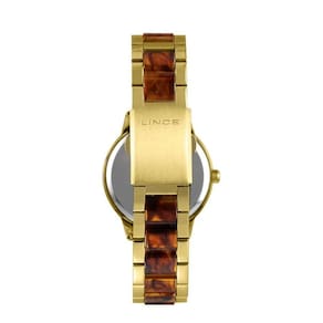 Especificações Técnicas: Marca: Lince Referência: LRT4792L38C3KN Gênero: Feminino Cor da Pulseira: Dourado com detalhes em marrom (tartaruga) Cor da Caixa: Dourado Material Da Pulseira: Aço Inox com resina Material Da Caixa: Aço Inox Tamanho da Caixa: 38 mm Resistência à água: 50 metros