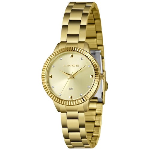 Relógio Lince Feminino Ref: Lrg4814l34 C1kx Fashion Dourado DESCRIÇÃO DO PRODUTO: Caixa: Metal Pulseira: Aço Medida da caixa: 34 mm Vidro: Cristal Mineral Resistência à água: 50m Funções: Analógico Mostrador champanhe com pedras Fundo Alimentação do Maquinário: Bateria Maquinário Japonês de 1 Ano Marca: Não Informado