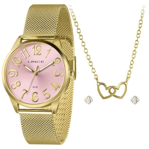 Relógio Lince Feminino Ref: Lrgh222l40 K0dbr2kx Dourado + Semijoia DESCRIÇÃO DO PRODUTO: Caixa: Metal Pulseira: Malha de Aço Mesh Medida da caixa: 40 mm Vidro: Cristal Mineral Resistência à água: 50m Funções: Analógico Mostrador rosa com todos os números Fundo Alimentação do Maquinário: Bateria Maquinário Japonês + Par de Brincos, Corrente e Pingente Semijoia de 1 Ano Marca: Não Informado