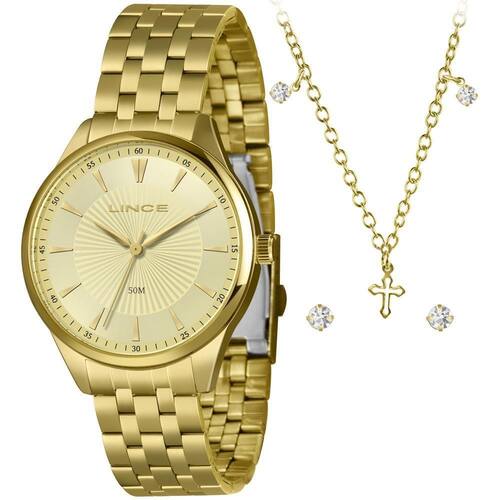Relógio Lince Feminino Ref: Lrgh223l40 K0dec1kx Dourado + Semijoia DESCRIÇÃO DO PRODUTO: Caixa: Metal Pulseira: Aço Medida da caixa: 40 mm Vidro: Cristal Mineral Resistência à água: 50m Funções: Analógico Mostrador dourado Fundo Alimentação do Maquinário: Bateria Maquinário Japonês + Par de Brincos, Corrente e Pingente Semijoia de 1 Ano Marca: Não Informado