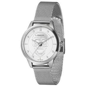 Relógio Lince Feminino Ref: Lrm4809l36 S1sx Caveira Mesh Prateado DESCRIÇÃO DO PRODUTO: Caixa: Metal Pulseira: Malha de Aço Mesh Medida da caixa: 36 mm Vidro: Cristal Mineral Resistência à água: 50m Funções: Analógico Mostrador prateado com detalhe de caveira Fundo Alimentação do Maquinário: Bateria Maquinário Japonês de 1 Ano Marca: Não Informado Ean: 7891529241509