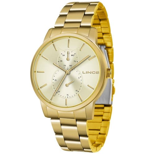 Relogio Lince LMGJ086L C1KX Feminino. Lince. Gênero: Feminino . Vidro: Cristal Mineral . Mostrador: Analógico . Cor/Material do Mostrador Dourado . Pulseira: Aço Inox . Caixa: Aço Inox . Aro: Aço Inox . Tampa do Fundo: Pressão. Tamanho da Caixa: 41 mm . Espessura da Caixa: 6 mm . Peso: 110 g. Funções. Funções: Analógico . Mecanismo: Quartzo . Alimentação: Bateria . ATM (Resistente à Água): 3 AMT / 30m.