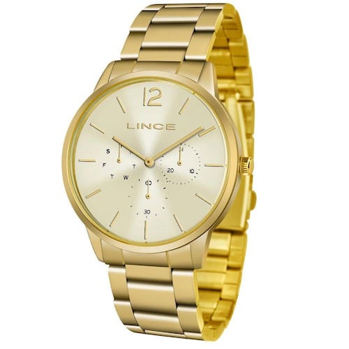 Mecanismo: Analógico Marca: Lince Cor: Dourado Resistência a água: 5 ATM - Natação Material da Pulseira: Aço Material da Caixa: Aço Relógio com pulseira articulada feita em metal. A caixa de formato redondo foi desenvolvida em metal. O visor é analógico. A resistência é de 5 ATM, permitindo nadar enquanto usa a peça.