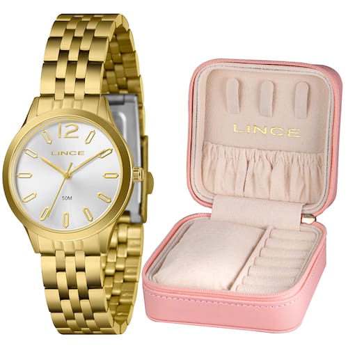 Características: com caixa dourada e pulseira em aço