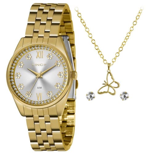 Marca: Lince Gênero: Feminino Visor: Prata, Champanhe, Rosa, Marrom e Preto Linha: Funny Vidro: Cristal Mineral Funções: Pressão: 50M Características: com caixa Dourada e pulseira em Aço Diâmetro da Caixa: 36mm