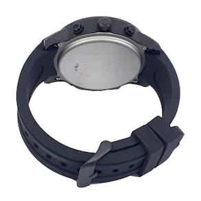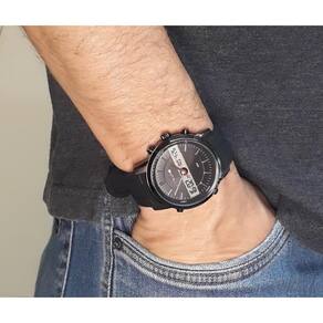cor da caixa: preto cor da pulseira: preto cor do aro: preto cor do mostrador: preto material da caixa: aço material da pulseira: silicone vidro: cristal mineral fundo parafusado: sim alarme: sim função chime: sim bip de hora cheia; aviso de hora em hora calendario: sim cronometro: sim iluminação noturna: sim mecanismo: digital e analogico fonte de energia: bateria