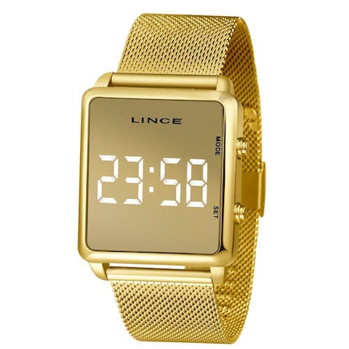 Marca: Lince Gênero: Feminino Visor: Led branco Linha: Led Vidro: Cristal mineral metalizado Funções: Pressão: 50 M Características: com caixa Dourada e pulseira Aço Tipo Mesh Diâmetro da Caixa: 34 mm