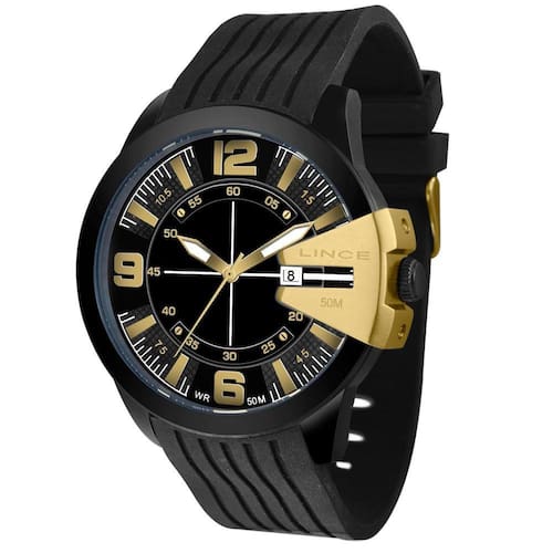 Marca: Lince Gênero: Masculino Vidro: Cristal Mineral Funções: Calendário Resistência à Água: 50 m Características: com caixa metal e pulseira de silicone Diâmetro da Caixa: 50 mm Garantia de 1 ano