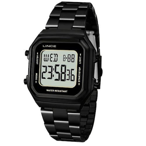 Relógio Lince Feminino.Modelo: SDN617L BXPX.Tamanho: Grande. .Funções . Digital. Cronometro. Alarme. Timer. Luz Noturna Verde. Calendário dia do mes e semana. .Características. Bateria. Botoes: Simples. Tampa posterior: Pressão. Resistência à água: 50m. Vidro: Cristal Mineral. Mostrador Positivo. Material da caixa: Aço Preto. Material da pulseira: Aço Preto. .Medidas . Diâmetro da caixa: 3,3 cm. Espessura da caixa: 1 cm. .Acompanha. Manual. Embalagem Lince. Garantia de 1 ano