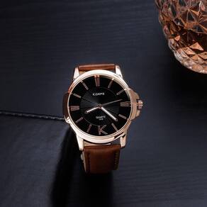 Relógio Luxo Masculino Korps 1319 Bronze Fundo Preto Pulseira Couro Marrom