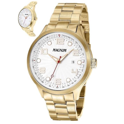 O Relógio Magnum Masculino Ref: Ma35146H Casual Dourado é o acessório perfeito para homens que buscam estilo e sofisticação. Com caixa e pulseira de aço inoxidável, esse relógio possui um design elegante e moderno, ideal para ser em diversas ocasiões. Com uma resistência à água de 10 ATM, esse relógio está preparado para te acompanhar em atividades do dia a dia, como lavar as mãos ou tomar banho. Seu fundo rosqueado garante maior segurança e proteção ao maquinário interno. O vidro de cristal mineral proporciona uma excelente resistência a riscos, mantendo o relógio sempre com uma aparência impecável. Com um diâmetro de caixa de 46.00 MM, esse relógio possui um mostrador branco com números, facilitando a leitura das horas. Além disso, esse relógio possui funções ógicas e calendário, permitindo que você se mantenha sempre organizado. Seu maquinário é alimentado por bateria, garantindo um funcionamento preciso e confiável. Com 2 anos de , você pode ter a certeza de adquirir um produto de alta qualidade e durabilidade. O Relógio Magnum Masculino Ref: Ma35146H Casual Dourado é o acessório perfeito para complementar o seu estilo e deixar o seu visual ainda mais elegante. Não perca essa oportunidade e adquira o seu agora mesmo! Marca: Não Informado
