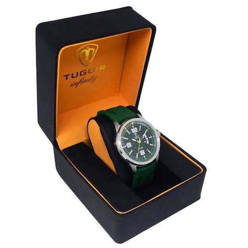 Relógio Masculino de Aço Tuguir ógico Infinity 9169F Prata e Verde Relógio Masculino de Aço Tuguir ógico Infinity 9169F Prata e Verde Marca: Tuguir Categoria: ógico ógico: Sim 1 Horário Ponteiros Fluorescentes: Não Digital: Não Luz: Não Resistente à Água: 5 ATM Pode ser para nadar no raso, por pouco tempo submerso - Respingos: Sim - Chuva: Sim - Lavar Carro: Sim - Lavar Louça: Sim - Natação: Sim - Mergulho: Não Característica do Vidro: Cristal Mineral Tipo de Fecho: Fivela Cor da Caixa: Prata Material da Caixa: Aço Formato da Caixa: Redondo Diâmetro da Caixa: 43,00 mm Espessura da Caixa: 10,00 mm Cor da Pulseira: Verde Material da Pulseira: Silicone Largura da Pulseira: 21,50 mm Comprimento Máximo da Pulseira: 260,00 mm Alimentação: Bateria Interna Peso Líquido: 0,080 Kg Modelo: Infinity 9169F Cor Predominante: Prata Cor Diferencial: Verde : 12 Meses Conteúdo da Embalagem: 01 Relógio 01 Embalagem 01 Termo de Marca: Não Informado