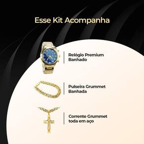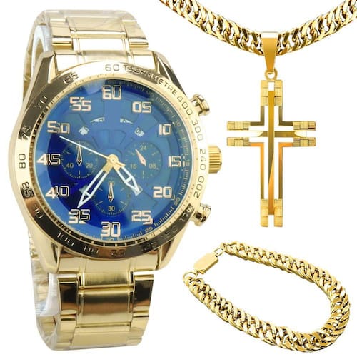 Relógio Masculino Dourado à Prova D'água, Fundo Azul - Aço Inoxidável Banhado a Ouro 18kAdicione um toque de elegância ao seu visual com este relógio masculino dourado. Feito de aço inoxidável banhado a ouro 18k, este acessório durável possui resistência à água, sendo perfeito para uso diário, inclusive durante atividades aquáticas leves. Com um estilo sofisticado, este relógio é ideal para qualquer ocasião.Cordão Grumet em Aço Banhado 18k (Aprox. 60cm)Complemente seu estilo com este cordão grumet em aço banhado a ouro 18k. Com aproximadamente 60cm de comprimento, este acessório elegante adiciona um toque de sofisticação e masculinidade ao seu visual diário.Pingente Grande em Forma de Cruz (Aprox. 4cm)Demonstre sua fé com estilo utilizando este pingente em forma de cruz. Com aproximadamente 4cm, este acessório se destaca e complementa perfeitamente qualquer colar ou corrente, expressando sua devoção de forma elegante.Pulseira Grumet Grossa Banhada 18k (Aprox. 21cm)Complete seu look com estilo utilizando esta pulseira grumet elegante e robusta. Com aproximadamente 21cm de comprimento, feita com aço banhado a ouro 18k, esta pulseira oferece conforto duradouro e resistência excepcional, sendo ideal para complementar seu visual diário ou em ocasiões especiais.Aproveite a oportunidade de presentear alguém especial com acessórios de qualidade neste final de ano. Não perca a chance de impressionar com presentes elegantes e sofisticados que complementam o estilo de quem você ama.