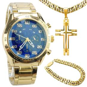 Relogio masculino aço banhado + cordão grosso + pulseira casual qualidade premium social fundo azul Não perca a chance de adicionar um toque de elegância ao seu visual com este conjunto de acessórios masculinos Este relógio dourado à prova d'água, feito de aço inoxidável banhado a ouro 18k, combina funcionalidade e estilo com perfeição. Além disso, o cordão grumet em aço banhado 18k e a pulseira grumet grossa também garantem durabilidade e sofisticação ao seu look. Complemente o conjunto com o pingente em forma de cruz para demonstrar sua fé de maneira elegante. Ideal para presentear alguém especial neste final de ano, esses acessórios de qualidade são perfeitos para qualquer ocasião Marca: Não Informado Ean: 7894118779698