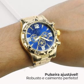 Adicione um toque de elegância ao seu visual com este incrível relógio masculino dourado. Com design à prova d'água e fundo azul, une funcionalidade e estilo com maestria. Material durável em aço inoxidável banhado a ouro 18k para durabilidade e brilho duradouro. Resistente à água, perfeito para uso diário, inclusive em atividades aquáticas leves. Estilo sofisticado, refinado e elegante, ideal para qualquer ocasião.