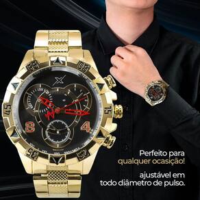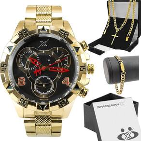 Relogio masculino aço dourado caixa pulseira analogico ponteiro mostrador preto grande religioso Kit de Presente Orizom Spaceman X - Relógio Masculino, Corrente, Pingente e Pulseira