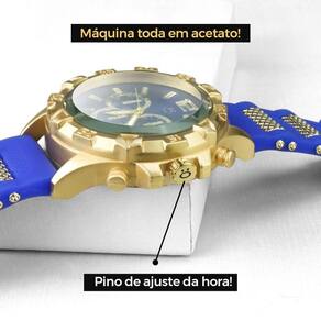 Detalhes do Produto: - Relógio Masculino Orizom Spaceman Tipo: Analógico Modelo: Spaceman Qualidade: Premium Material: Maquinário em aço inoxidável banhado a ouro, oferecendo durabilidade e um visual refinado Formato: Redondo Mostrador: Azul profundo, com detalhes internos como números e desenhos que podem variar conforme a montagem no ato da compra Pulseira: Silicone azul ajustável, adaptável a qualquer dimensão de pulso para máximo conforto Tampa: Blindada com arte exclusiva de Jesus Cristo, conferindo autenticidade e simbolismo ao relógio