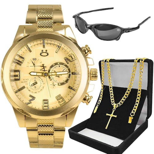 Relogio masculino aço inox banhado + oculos sol + cordão Relógio Masculino Analógico Orizom Spaceman - Banhado Dourado, Todo em Aço Inoxidável