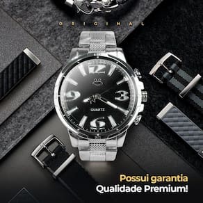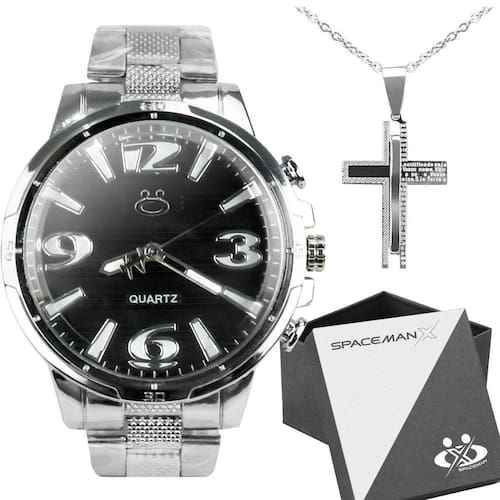 Relogio masculino aço inox + caixa qualidade premium casual chegou o relógio analógico prateado da Orizom Spaceman, com um design moderno e elegante Com fundo preto e estrutura em aço inoxidável, este relógio oferece uma leitura descomplicada, ideal para o dia a dia. Atente-se apenas para o contato excessivo com água, pois ele não é à prova d'água.