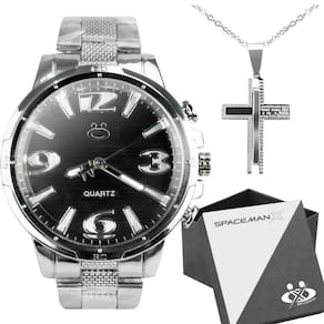 Relogio masculino aço inox + cordão pingente cruz + caixa chegou o relógio analógico prateado da Orizom Spaceman, com um design moderno e elegante Com fundo preto e estrutura em aço inoxidável, este relógio oferece uma leitura descomplicada, ideal para o dia a dia. Atente-se apenas para o contato excessivo com água, pois ele não é à prova d'água.