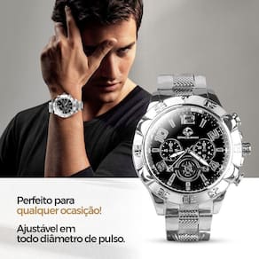 Seu mostrador preto elegante, formato redondo e marcadores nítidos garantem uma leitura fácil e precisa do tempo, tornando-o ideal para diversas ocasiões, de reuniões formais a eventos casuais.