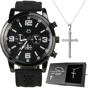 Relogio Masculino Aço Preto + Colar Crucifixo Prateado