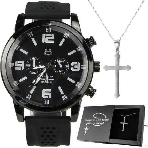 Relogio masculino aço preto + colar crucifixo prateado ponteiro social ajustavel inoxidável robusto Kit de Acessórios Masculino Orizom - Linha Jesus na Cruz