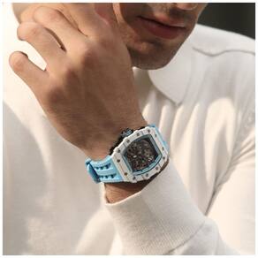 Cristal de safira altamente translúcido e luminoso de grau A Grau 9 dureza Mohs safira incolor com revestimento anti reflexo com processo de moagem a frio de diamante quatro vezes mais caro do que o processo tradicional de dobra de calor, tornando o mais forte do que outros materiais naturais, exceto diamantes, a safira revela o fundo de caixa esqueletizado cercado pelo bisel diante de seus olhos. Um grau luminoso, cheio de energia brilhante, continua a iluminar por 4 horas, permitindo que você veja o tempo no escuro.