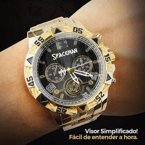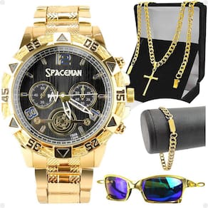 Relógio Masculino Analógico Banhado Aço Inox + Cordão e Pingente + Pulseira + Óculos Sol Proteção UV - Orizom Spaceman Kit Presente Masculino Orizom Spaceman - Relógio, Corrente, Pingente, Pulseira e Óculos de Sol Seja o centro das atenções com o Kit Presente Masculino Orizom Spaceman, uma combinação impecável de requinte, estilo e excelência. Surpreenda aquele homem especial em sua vida com este conjunto exclusivo que certamente irá impressioná-lo. - Relógio Masculino Analógico Orizom Spaceman com temática de Dragão: O design todo dourado, banhado em aço inoxidável e com uma arte meticulosamente detalhada de um dragão na tampa blindada irá adicionar um toque de mistério e poder ao seu pulso. - Corrente Grumet Banhada em Aço Inoxidável: Com cerca de 60cm de comprimento, esta corrente grumet exala elegância e sofisticação, elevando qualquer visual. - Pingente Cruz Banhado em Aço Inoxidável: Adicione estilo e significado pessoal ao seu conjunto com este pingente em forma de cruz, refletindo sua fé e personalidade. - Pulseira Grumet Banhada em Aço Inoxidável: Com aproximadamente 25cm de comprimento, esta pulseira grumet complementa o conjunto de forma magistral, conferindo uma aparência completa e sofisticada. - Óculos de Sol masculino Orizom Spaceman Dourado: Proteja seus olhos com muito estilo e qualidade. Com em acetato, hastes em metal e lentes que oferecem proteção UV, estes óculos de sol premium garantem conforto e proteção sem comprometer o estilo. Este kit é a opção perfeita para presentear em aniversários, ocasiões especiais ou simplesmente para mostrar o quanto ele é significativo para você. Combina elegância, estilo e funcionalidade em cada detalhe. Marca: Não Informado