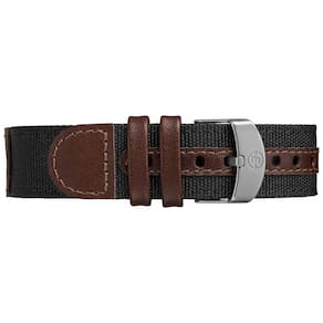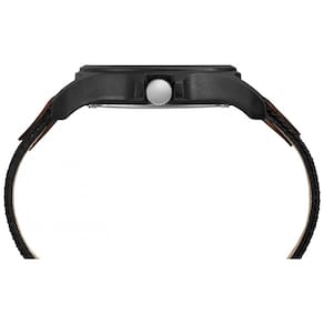 Couro preto e marrom ajustável de 20 milímetros e pulseira de tecido se ajusta a uma circunferência de pulso de até . Mostrador preto com algarismos arábicos completos Janela de data às 3 horas horário militar 24 horas. Caixa de resina preta durável de 40 milímetros com cristal acrílico. Mostrador de relógio iluminado Indiglo mãos luminosas. Resistente à água até 50 metros 165 pés Em geral, adequado para curtos períodos de natação recreativa, mas não mergulho ou snorkeling