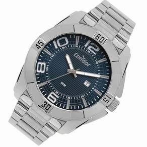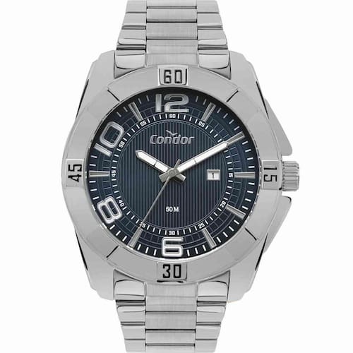 Relógio Masculino Analógico Condor Prata - COPC32ES/4A Marca: Condor; Modelo: COPC32ES/4A; Mecanismo: Quartzo; Material da Caixa: Metal; Cor da Caixa: Prateado ; Display/mostrador: Analógico, Mostrador Azul; Ponteiros: Prateado e Fosforescente; Possui Calendário: Sim; Material da Pulseira: Aço Inoxidável; Cor da Pulseira: Prateado; Tipo de Vidro: Cristal Mineral; Resistência à Água: 05 ATM 50 Metros ; Permite Lavar as Mãos: Sim; Permite Respingos de Chuva: Sim; Permite Entrar na Piscina: Não ; Permite Nadar Com o Relógio: Não; Permite Usar no Mar: Não; Peso Aproximado: 147g; Diâmetro da Caixa Aprox.: 50mm; Diâmetro da Caixa com Coroa Aprox.: 54mm; Espessura da Caixa Aprox.: 12mm;