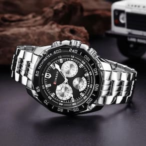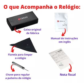 Cor: Prata/Preto Tipo De Item: Relógio De Pulso Marca: Curren Estilo Do Relógio: Fashion Casual Gênero: Masculino Dial Display: Analógico Ponteiros pequenos: Não são funcionais Movimento: Quartz Modelo: 8077 Resistencia à Água: 3BAR/3ATM /30M - Respingos: Sim - Chuva: Sim - Lavar Louça: Sim - Natação: Não - Mergulho: Não Formato Do Mostrador: Redondo Diâmetro Do Mostrador: 4,3 cm Material Do Mostrador: Vidro Hardlex Espessura Da Caixa: 1,1 cm Material Da Caixa: Liga Metálica De Alta Qualidade Cores: Prata/Preto e Prata/Prata Tipo De Fecho: Fecho Dobrável Com Trava Material Da Pulseira: Aço Inoxidável Cor Da Pulseira: Azul/Preto/Prata Largura da Pulseira: 2,1 cm Comprimento Total: 21 cm : 03 Meses Conteúdo da Embalagem: - Relógio - Estojo do relógio Marca: Não Informado
