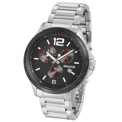 Confeccionado com caixa assim como a pulseira em aço, o Relógio Masculino Analógico Magnum, conta com sistema analógico de horário, formato 12/24 de horas e cronógrafo progressivo.