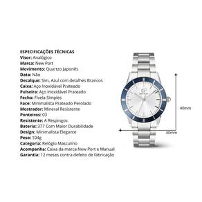 O Relógio Daytona 40mm é um tributo ao universo das corridas clássicas e à engenharia de ponta. Inspirado na lendária atmosfera de Daytona Beach e nas pistas da NASCAR, este modelo da coleção Titanium une performance, sofisticação e minimalismo urbano. Com caixa de 40mm em aço prata cromado, pulseira de elos robusta, e um fundo prata perolado minimalista, o Daytona transmite elegância com espírito competitivo. O decalque lateral azul metálico remete aos detalhes aerodinâmicos dos carros de corrida de elite com muita funcionalidade precisa e sutil. Criado para homens que vivem em movimento, o Daytona representa mais do que estilo — é uma afirmação de ritmo, potência silenciosa e domínio do tempo. Medidas: - Diâmetro 40mm da caixa - Comprimento da Alça 24cm - Espessura da caixa 07mm - Largura da Correia de 20mm ESPECIFICAÇÕES TÉCNICAS - Visor: Analógico - Marca: New Port - Movimento: Quartzo Japonês - Data: Não - Decalque: Sim, Azul Com Detalhes Brancos - Caixa: Aço Inoxidável Prateado - Pulseira: Aço Inoxidável Prateada - Fecho: Fivela Simples - Face: Minimalista Prata Perolado - Mostrador: Mineral Resistente - Ponteiros: 03 - Resistente: A Respingos - Bateria: 377 Com Maior Durabilidade - Design: Minimalista Elegante - Peso: 104g - Categoria: Relógio Masculino - Acompanha: Caixa da marca New Port e Manual - Garantia: 12 meses contra defeito de fabricação Após a confirmação de compra, o código de rastreio será enviado em até um dia útil em seu e-mail. Marca: Não Informado