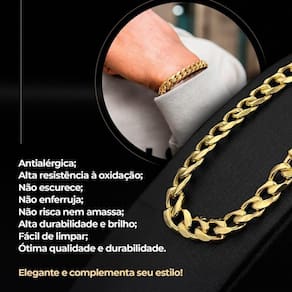 Acompanhando o relógio está uma corrente de aço inoxidável banhado grumet de aproximadamente 60cm de comprimento. Esta corrente robusta e elegante complementa perfeitamente o relógio, adicionando um toque de glamour a qualquer visual masculino. Além disso, o kit inclui um pingente pequeno em aço inoxidável banhado em formato de cruz, perfeito para adicionar um toque de significado e espiritualidade ao conjunto. Para completar, uma pulseira em aço inoxidável banhado grumet de aproximadamente 25cm de comprimento é incluída, proporcionando uma aparência coesa e elegante.