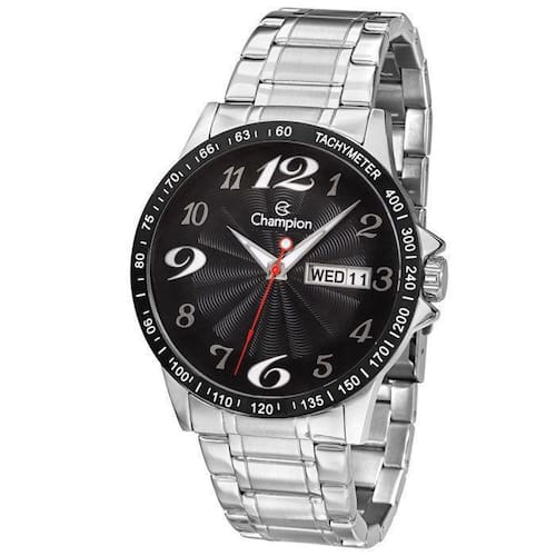 Relógio Masculino Champion Ca31159T Compre o Relógio Masculino Champion CA31159T. O relógio possui mecanismo Analógico e a pulseira é na cor Prata, fabricada em Metal, com 23 cm de comprimento. A Caixa peça onde fica o mostrador é fabricada em Metal e mede 4,5 cm de diâmetro. O Relógio Masculino Champion CA31159T tem nível de resistência à água especificado em 05 ATM. Acompanha manual de instruções e certificado de do fabricante. Ficha técnica - Calendário: Sim - Resistência à Água: 05 ATM - Material da Pulseira: Metal - Cronógrafo: Não - Gênero: Masculino - Mecanismo: Quartz - Cor da Caixa: Preto - Material da Caixa: Metal - Cor do Mostrador: Preto - Alarme: Não - Diâmetro da Caixa: 4,5 cm - Estilo: Sociais - Cor da Pulseira: Prata - Display: Analógico - Vidro do Relógio: Cristal - Comprimento da Pulseira: 23 cm Marca: Não Informado