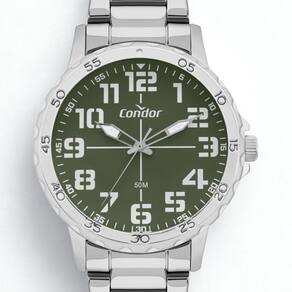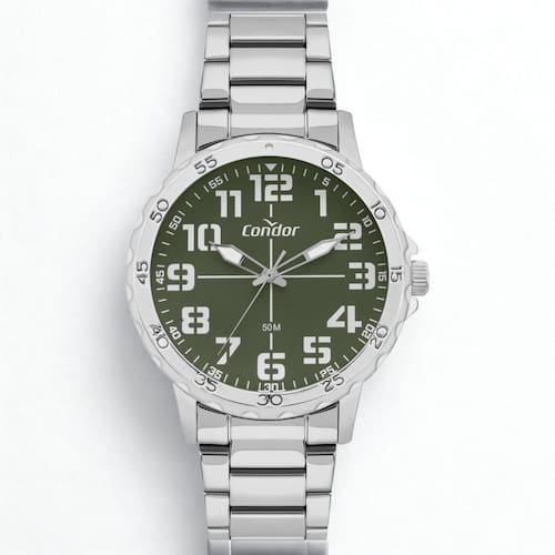 Descubra a força do lançamento de militar. Relógio de aro com marcação de minutos e mostrador com numeração completa, com pulseira em 3 links e banho prateado e mostrador na cor verde.