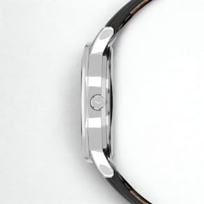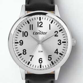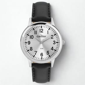 O lançamento traz um relógio de couro preto e com caixa prateada, seu mostrador é de fácil leitura e sua numeração completa.